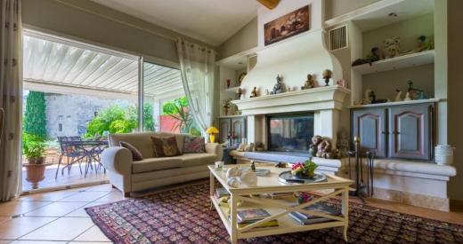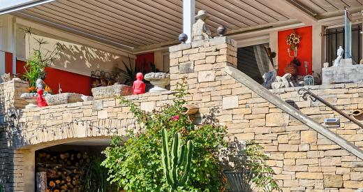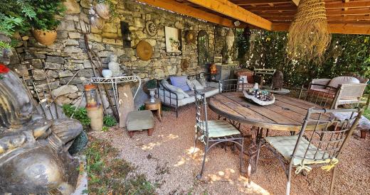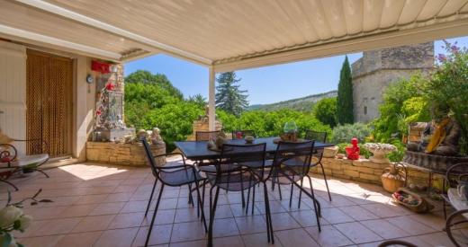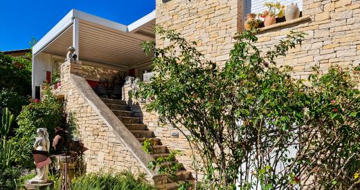 Au Sud, découvrez la terrasse avec pergola bioclimatique et stores automatisés et qui vous permettra de profiter d'une vue sur le vieux pigeonnier et la campagne environnante.